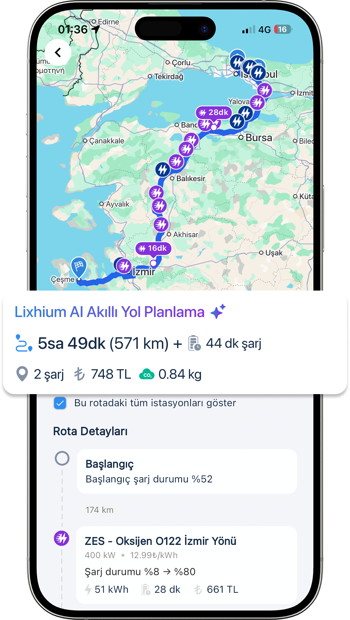 AI Rota Planlama ile yolculuklarını önceden planlayan Lixhium kullanıcıları %25'e kadar enerji tasarrufu sağlıyor.